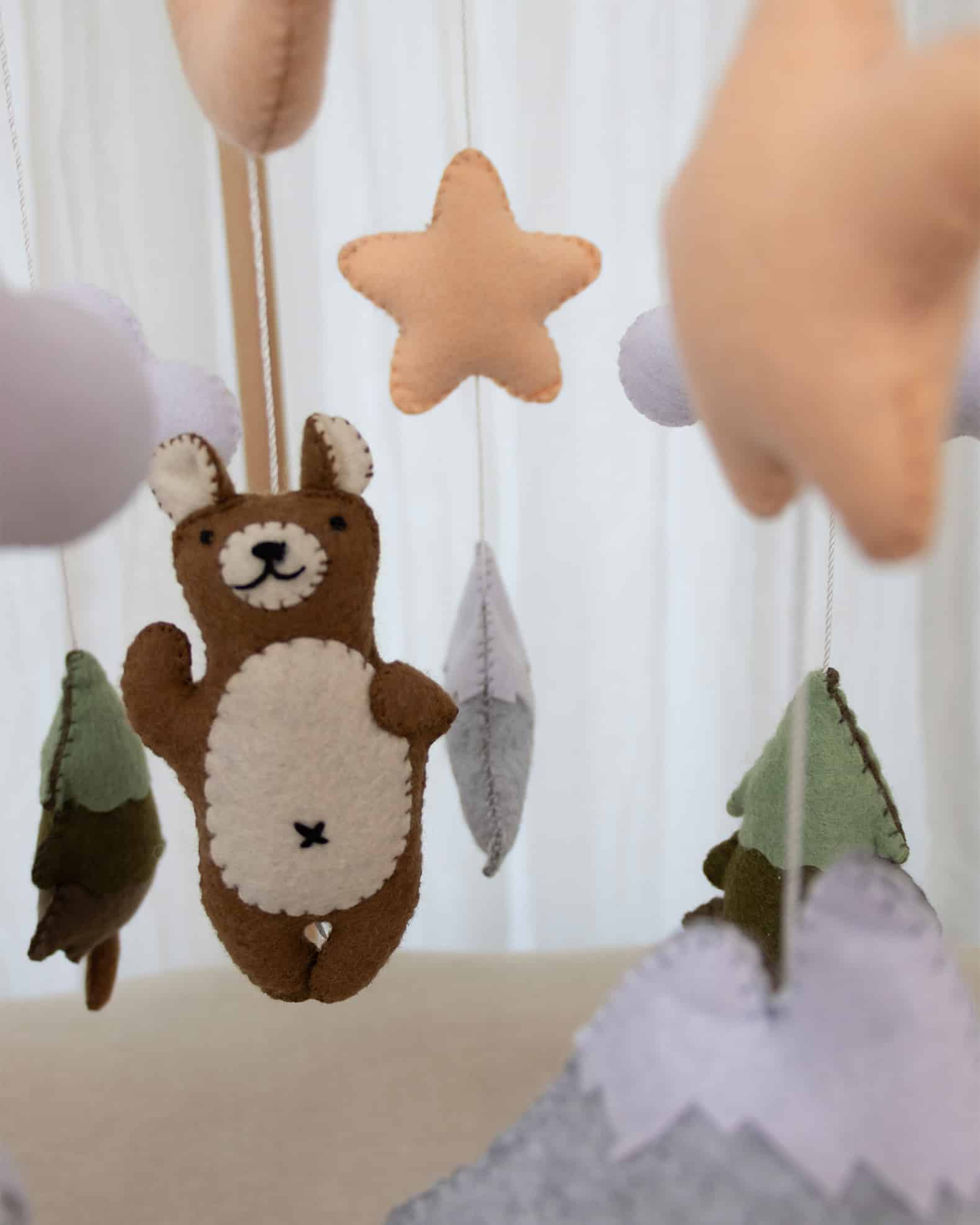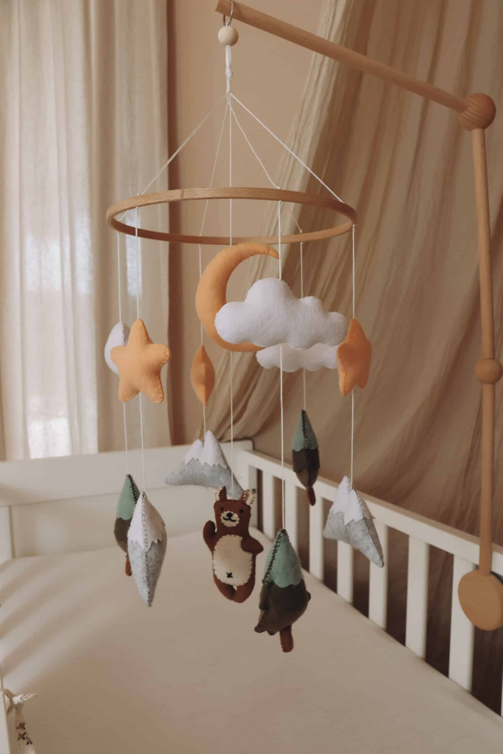 Start on a natural adventure with our unique brown bear baby mobile! This beautiful mobile brings the beauty of nature into the nursery, where an adorable brown bear floats between mountains, twinkling stars, a gleaming moon, and soft clouds. Each component is lovingly handmade, creating a beautiful nursery. Let your baby’s imagination journey through natural landscapes as they dream of adventures. Give your baby the gift of nature and watch their eyes sparkle with wonder and joy!